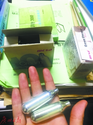 記者購買到的“笑氣彈”。廣州日報(bào) 圖熱點(diǎn)回顧:女生吸“笑氣”險(xiǎn)成“廢人”