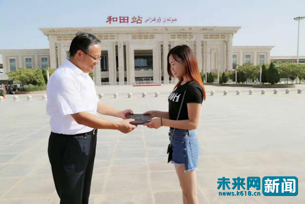 原來(lái),在得知學(xué)生無(wú)法回學(xué)校參加畢業(yè)典禮后,校黨委書(shū)記李玉鴻感到很遺憾,決定在去和田探親時(shí),親自為她頒發(fā)畢業(yè)證書(shū)。李玉鴻8日早上八點(diǎn)半從昌吉出發(fā),今天十一點(diǎn)到和田站,T9526次列車(chē)經(jīng)過(guò)23個(gè)多小時(shí)行駛2000公里,終于到達(dá)和田。下車(chē)后,李玉鴻看見(jiàn)學(xué)生已經(jīng)在車(chē)站門(mén)口等著了!半m然這件事對(duì)學(xué)校來(lái)講不算大事,但對(duì)學(xué)生來(lái)說(shuō),她很開(kāi)心!蓖醴祭蠋熣f(shuō)。