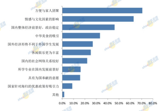 回國發(fā)展原因調(diào)查顯示,“方便與家人團聚”和“情感與文化因素的影響”是兩大主因,分別占比70.6%和63%。這與調(diào)查樣本中70.8%的海歸是獨生子女這一事實不無關(guān)系。國內(nèi)經(jīng)濟增長,政治穩(wěn)定;飲食文化、國外經(jīng)濟形勢不利于外國學(xué)生發(fā)展、國內(nèi)休閑娛樂更為豐富等方面因素比例均超過25%。另外,國內(nèi)社會網(wǎng)絡(luò)關(guān)系、所學(xué)專業(yè)在國內(nèi)發(fā)展前景、奉獻精神等亦是重要原因,分別占22%、16.2%、15.8%。因國家相關(guān)優(yōu)惠政策而歸國的人員僅占8.8%。