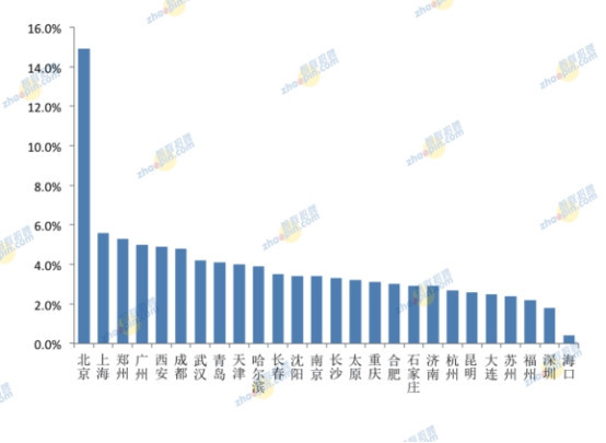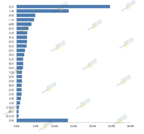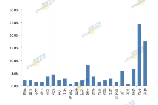 從海歸出生地來看,北京穩(wěn)居首位,且比例遠遠超過其它地方。上海、鄭州、廣州、西安、成都居前六位。其它各城市占比依次遞減,但差距微小,且地域涵蓋我國東、中、西各地區(qū)。