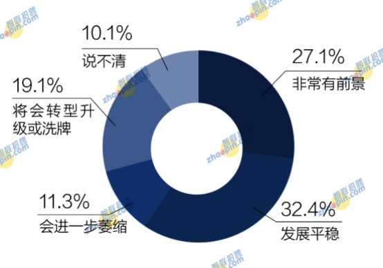 在對目前單位所在行業(yè)未來十年發(fā)展前景的看法上,海歸群體整理持樂觀態(tài)度,認為非常有前景的占27.1%,發(fā)展平穩(wěn)的占32.4%,將會轉(zhuǎn)型升級或洗牌的占19.1%,認為會進一步萎縮的占11.3%,另有10.1%認為說不清。