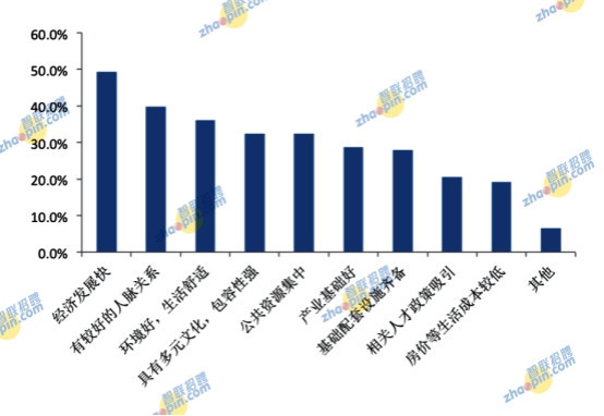 選擇創(chuàng)業(yè)城市的理由呈多樣化特征。其中經(jīng)濟發(fā)展、人脈關(guān)系、環(huán)境舒適、文化多元包容性強、公共資源集中五類原因排名靠前,占比依次為49.3%、39.7%、36%、32.4%、32.4%。可以看到,城市發(fā)展的軟實力更受海歸創(chuàng)業(yè)者關(guān)注。其次,產(chǎn)業(yè)基礎(chǔ)、配套設(shè)施、人才政策、房價等生活成本,占比分別為28.7%、27.9%、20.6%、19.1%。
