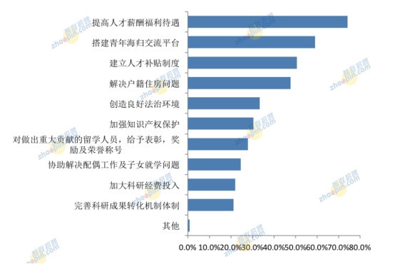 通過調(diào)查發(fā)現(xiàn),吸引留學(xué)生方面,政府應(yīng)完善的激勵保障政策主要有四個方面:提高人才薪酬福利待遇(74.2%)、搭建青年海歸交流平臺(59%)、建立人才補貼制度(50.6%)、解決戶籍住房位居前四位(47.8%),其次是創(chuàng)造良好的法治環(huán)境(33.4%)、加強知識產(chǎn)權(quán)保護(30.4%)。表彰重大貢獻、解決子女教育等關(guān)注度較低,均低于30%。