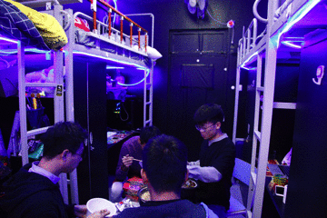 “我們的整體設計是一個太空艙。”鄧亞東說,他打開27日晚上拍的照片,宿舍四個同學都坐在自己的座位上,房頂中央的白熾燈被關上,從床邊和房頂四周延伸過去的LED燈帶閃著藍色的光,從門口看去,確實像是進了一個微型艙內。