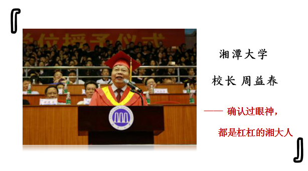 今天在座的你們,陌生又熟悉。陌生的是,我叫不出每個人的名字,說不出每個人的專業(yè);熟悉的是,我們或者在教室聽過課,或者在食堂拼過桌,或者在校園擦肩而過。我想,假如顏值可以當(dāng)飯吃,你們一定可以養(yǎng)活整個世界!今天,我站在這里,又一次跟大家確認(rèn)了眼神,你們都是杠杠的湘大人!都是永遠(yuǎn)的湘大姑娘、永遠(yuǎn)的湘大小伙!