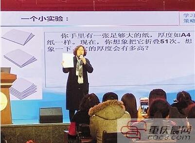 你手里有一張足夠大的紙,厚度如A4紙一樣,你能想象把它折疊51次,厚度會有多高嗎?昨日,中國心理學(xué)會會員、中科院心理所《學(xué)習(xí)策略研究》課題組成員朱淑玲來到渝中區(qū)中華路小學(xué),與大家分享如何做一名智慧的學(xué)習(xí)型家長。
