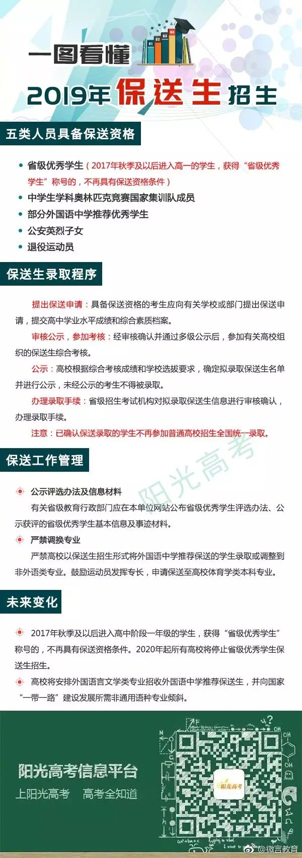 一圖看懂2019年保送生招生 你符合條件么?,(記者 何淼)據(jù)教育部官方微博消息,2019年高校招收保送生工作已拉開帷幕。教育部推出圖解具體說(shuō)明高校招收保送生工作,其中包含保送生資格、錄取程序、招生變化等內(nèi)容?磮D↓↓ 。ń逃啃侣勣k官方微博截圖)