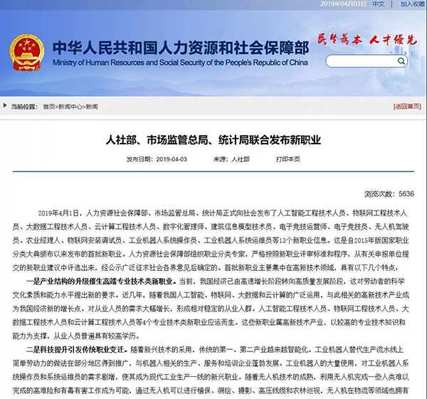 據(jù)人力資源社會保障部有關(guān)負(fù)責(zé)人介紹,這13個新職業(yè)包括人工智能工程技術(shù)人員、物聯(lián)網(wǎng)工程技術(shù)人員、大數(shù)據(jù)工程技術(shù)人員、云計算工程技術(shù)人員、數(shù)字化管理師、建筑信息模型技術(shù)員、電子競技運營師、電子競技員、無人機(jī)駕駛員、農(nóng)業(yè)經(jīng)理人、物聯(lián)網(wǎng)安裝調(diào)試員、工業(yè)機(jī)器人系統(tǒng)操作員、工業(yè)機(jī)器人系統(tǒng)運維員等。此次發(fā)布的13個新職業(yè)主要集中在高新技術(shù)領(lǐng)域,是自2015年版國家職業(yè)分類大典頒布以來發(fā)布的首批新職業(yè)。