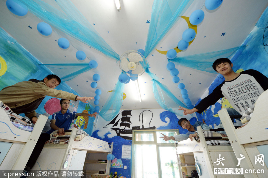 2013年10月26日,重慶西南大學(xué)學(xué)生會舉辦了一場新生宿舍美化大賽,數(shù)以千計的新生參與。許多創(chuàng)意獨(dú)特的95后,花了不到200元,就把寢室裝出了高端洋氣上檔次的格調(diào)?ㄍㄙu萌、奇幻漂流、文藝范兒……來看看他們的宿舍風(fēng)格與背后的故事吧?蓯劭ㄍ▔γ咳擞忻让奚幔航(jīng)濟(jì)管理學(xué)院工商管理專業(yè)大一男生宿舍竹園C棟316室花費(fèi):不超過100元,主要花費(fèi)在顏料紙張上畫著卡通小黃人的墻、維尼熊馬克杯、小螞蟻粉T恤……若不是墻角散落著的幾只略有味道的球鞋,你很難將眼前這間宿舍與男生聯(lián)系在一起。這間宿舍萌至如此,必須歸功一個人:宿舍的賣萌小王子詹鑫豪。自打入校的第一天起,發(fā)嗲、買各類賣萌產(chǎn)品……詹同學(xué)盡顯賣萌本色。在他的影響下,宿舍其他5個哥們也發(fā)現(xiàn)了自己的賣萌天分,集體賣萌成了宿舍的風(fēng)氣。比如:大家集體購買了一系列風(fēng)格迥異的卡通睡衣,包括奶牛版、熊貓版等;再比如,大家有了一個個超萌的外號:大狼、肥羊、猴子、毛毛、嚶。在寢室美化設(shè)計時,詹鑫豪出力不少!拔覀冇媱澰趬ι袭孅c(diǎn)東西,但別的東西都好難畫,我突然想到近期看的動畫片《卑鄙的我》里的小黃人,不是正好又萌又簡單嗎?”全宿舍一致認(rèn)可這個提案,詹鑫豪更主動承擔(dān)起為小黃人上色的任務(wù)。自稱“不擅賣萌”的周密同學(xué)表示,“相比很多同齡人,我們宿舍顯得比較幼稚。但用萌這種方式記錄生活,算是青春記憶吧!弊霞喪酵挷璧纴硐喟樗奚幔和鈬Z學(xué)院免師英語專業(yè)大一7班女生宿舍桃園1棟201室花費(fèi):不超過200元,主要用于買卡通畫和紫紗擁有一個童話古堡,是萬千少女的夢想,英語班的幾位同學(xué)把它變成了現(xiàn)實。最初,室長吳倩一提議走公主風(fēng),立馬獲得壓倒性的支持。此后給宿舍起名字、設(shè)計細(xì)節(jié)等,遇到意見不一致時,都是以少數(shù)服從多數(shù)為原則,“但有一點(diǎn):不能放馬后炮!备髯砸鹿裆系木S尼熊、米老鼠,搭在蚊帳上的層層紫色紗布,甚至在廁所門前專門貼了一張公主畫……公主風(fēng)鋪天蓋地而來。這間宿舍在全院打響名號,除了夢幻的布置,還離不開室友袁凡的宣傳。宿舍里兩套精致的茶幾頗引人注目,它們的主人、被同學(xué)們盛贊為“茶神”的妹子來自云南,家鄉(xiāng)盛產(chǎn)普洱茶,“我們家很多人是茶文化愛好者。我平時泡了茶,就會喊大家來喝,享受泡茶、品茶的過程。”時光軸愛上照片墻宿舍:經(jīng)濟(jì)管理學(xué)院農(nóng)業(yè)經(jīng)濟(jì)管理大一1班女生宿舍南苑9舍525室花費(fèi):不超過200元,錢主要用在購買顏料、卡紙等上愛拍照、愛旅游、愛泡咖啡館……在王麗君看來,宿舍姐妹們雖然性格有靜有動,但或多或少都有顆文藝的心。這也很好地解釋了為什么舍長宋錦雯一提議宿舍美化走文藝范,大家都舉雙手贊成!安蝗绾腿巳司W(wǎng)一樣,我們也建一個實體版的時光軸”、“不如我們貼上黃色的墻紙,讓宿舍看起來像個咖啡館”……確立主題后,舍友們你一言我一語開始構(gòu)思細(xì)節(jié)。很快,時光軸火速出爐,事后它確實成為了宿舍的一大標(biāo)志。時光軸的主材料是涼席和各張打印出來的照片以及文字解說。時光軸上,記錄了大家相處的兩個多月美好時光。王麗君向記者介紹,“第一張是軍訓(xùn)開始前在宿舍的第一張合影,第二張是軍訓(xùn)拉練時我們疲憊狀態(tài)下的自拍,第三張是班級第一次聚餐,我們宿舍的坐在一起……”談起“時光軸”的未來,王麗君表示,“我們都是自拍狂,也特別喜歡記錄生活的點(diǎn)點(diǎn)滴滴,所以未來肯定會有更多精彩照片,我們還會分享出來,當(dāng)然那時我們可以選擺更美的照片!
