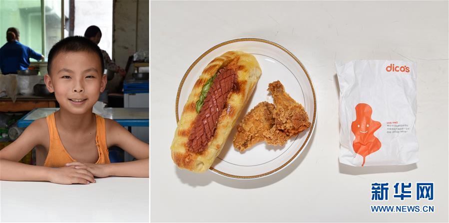 拼版照片:在四川省巴中市南江縣八廟鎮(zhèn),今年8歲的馮可家準(zhǔn)備吃由姐姐從縣城買來(lái)的快餐——火腿腸面包和炸雞翅。臨近開學(xué),在河北上大學(xué)的姐姐即將返校,她臨走前為弟弟馮可家準(zhǔn)備了他最愛吃的午餐。2016年8月21日。新華社記者劉坤攝
