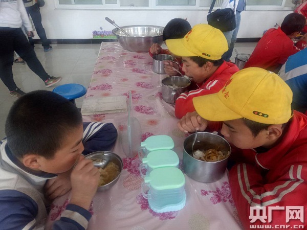 甘溝小學(xué)的學(xué)生在吃營(yíng)養(yǎng)午餐 攝/記者 王啟慧