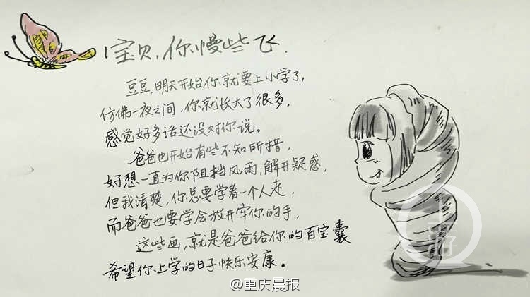 “豆豆,明天開始你就要上小學(xué)了,仿佛一夜之間,你就長大了很多……這些畫,就是爸爸給你的百寶囊……”重慶6歲女孩豆豆該上小學(xué)了,豆豆爸用一組“滿滿都是愛”的手繪圖,畫出了對女兒的叮囑和期望。網(wǎng)友:好暖,別人家的爸爸……
