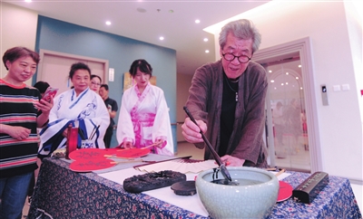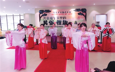 “粽香四溢飄蕩,扇面書法有長;姐妹演繹漢禮,描紅寫就詩章;答題接龍獲獎,節(jié)日歡聚一堂;企業(yè)搭臺唱戲,居家養(yǎng)老歡唱!”活動現(xiàn)場,一位阿姨自告奮勇地要向大家分享她即興創(chuàng)作的小詩,“今天能夠與大家歡聚一堂,一起過節(jié),一起體味傳統(tǒng)文化,是一種難得的體驗和經(jīng)歷。我們愿意與年輕人一起,為振興傳統(tǒng)文化、發(fā)揚優(yōu)秀民俗貢獻(xiàn)一份自己的力量。”