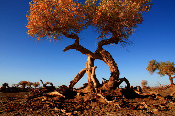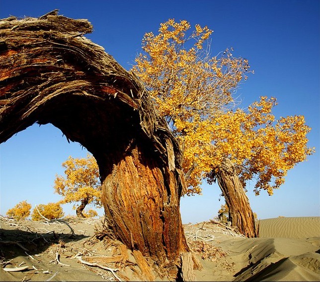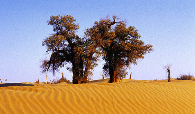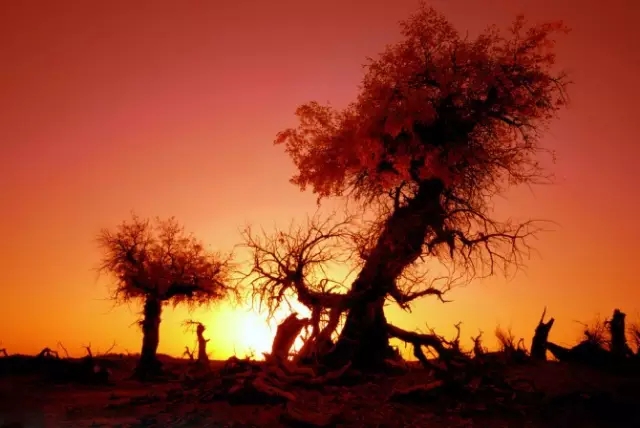 胡楊林是塔里木河流域典型的荒漠森林草甸植被類(lèi)型,從上游河谷到下游河床均有分布。雖然胡楊林結(jié)構(gòu)相對(duì)簡(jiǎn)單,但具有很強(qiáng)的地帶性生態(tài)烙印。無(wú)論是朝霞映染,還是身披夕陽(yáng),它在給人以神秘感的同時(shí),也讓人解讀到生機(jī)與希望。據(jù)有關(guān)資料顯示,人們還夸贊胡楊巨大的生命力是“三個(gè)一千年”,即活著一千年不死,死后一千年不倒,倒后一千年不朽。