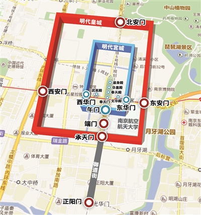 明代皇城范圍,東起今南京機電學(xué)校與南京博物院以西一線,西至竺橋、逸仙橋一線,南到光華門,北至佛心橋。南北長2.5公里,東西寬2公里,周長9公里。