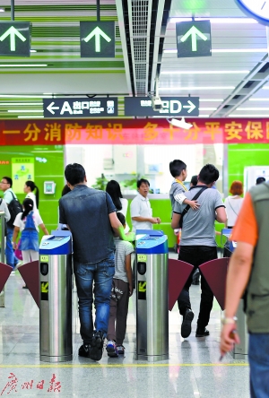 家長(zhǎng)帶著兒童進(jìn)地鐵閘口。