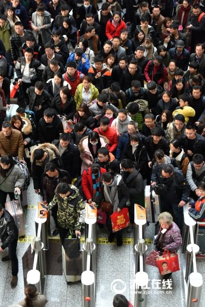 1月22日,杭州火車東站候車大廳人潮涌動,旅客們歸心似箭,行色匆匆。2017年春節(jié)日益臨近,鐵路春運在節(jié)前最后一個周末迎來客流高峰。從杭州前往云貴、川渝、兩湖等中長途返鄉(xiāng)探親客流已全線啟動。(浙江在線記者 董旭明 攝)