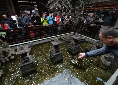中午時分,記者又一次仔細(xì)觀察了水池,在游人拋投硬幣時,確實有一兩條金色的觀賞魚在石縫處游動著。在木制欄桿四周,正貼著“禁止倚靠欄桿”、“禁止投幣”等字樣。“春節(jié)游客爆滿,水池是從寬巷子到窄巷子的必經(jīng)之道,加上很多人在拋硬幣,頓時人滿為患。我們只好打印了幾張?zhí)嵝褟堎N起來!鞭k公室工作人員還表示,“等春節(jié)游客潮稍微退卻,天氣回暖,我們就要派人下水打撈這些硬幣,用于景點建設(shè)!