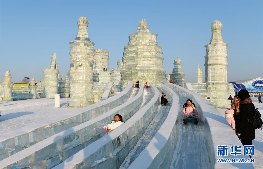 2月7日,游客在哈爾濱冰雪大世界園區(qū)玩冰滑梯。春節(jié)長(zhǎng)假后,哈爾濱冰雪大世界依舊游人如織,流光溢彩的冰建筑、巧奪天工的冰雕作品和百玩不厭的冰雪娛樂(lè)活動(dòng),讓天南海北的游客流連忘返。新華社記者 王建威攝