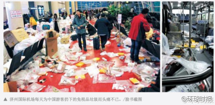 “濟(jì)州機(jī)場的中國游客所過之處一片狼藉”,韓國《朝鮮日報(bào)》15日以此為題報(bào)道稱,濟(jì)州市民盧某12日在“臉譜”上發(fā)文稱:“中國人瘋狂地撕掉免稅品的包裝,清潔員們默默地把這些包裝在一邊堆成小山一樣。這筆(清理)垃圾的費(fèi)用應(yīng)該也是由市民們負(fù)擔(dān)的,我第一次覺得有必要收取(游客的)入島費(fèi)”。
