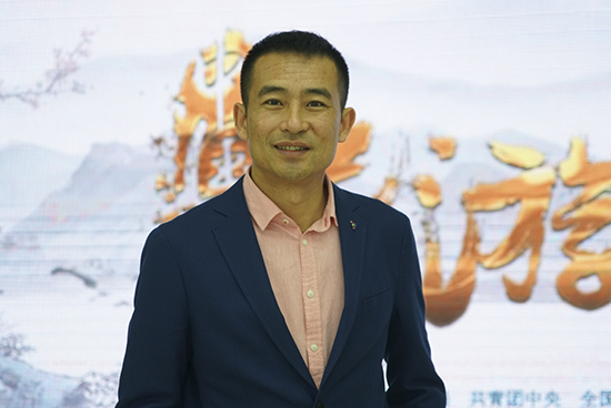 舞臺上舉著導(dǎo)游旗講解的劉凱。實習(xí)生王趙童 攝
