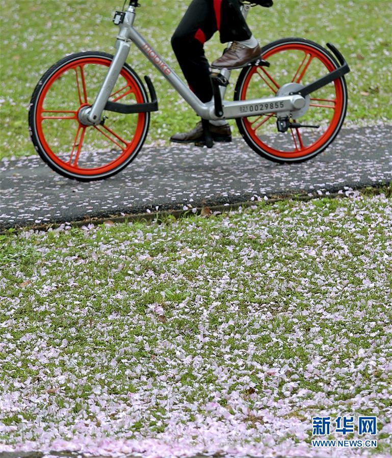 •   4月17日,一場春雨過后,蘇州市民騎車經(jīng)過落滿櫻花的盛家?guī)贰P氯A社發(fā)(王建中 攝)
