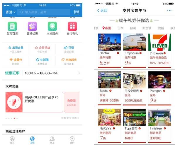 比如,在港澳臺,打開支付寶“發(fā)現(xiàn)”,你可以找到屈臣氏、豐澤電器、瑞士雷達(dá)表、長板壽司的5折優(yōu)惠券;在日本,可以找到唐吉坷德滿3萬日元立減2000的優(yōu)惠;新加坡可以找到4折的名勝世界演出票等等。使用時也很方便,領(lǐng)取后只要打開優(yōu)惠券,點擊付款就能安優(yōu)惠價掃碼付款。