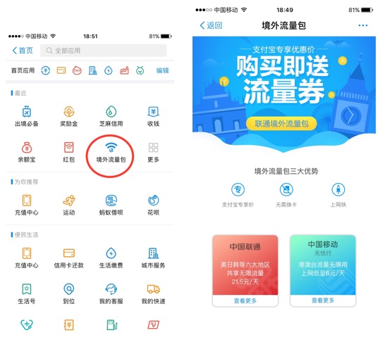 境外最常碰到一個問題是:手機漫游上網(wǎng)太貴,卻又不方便換當(dāng)?shù)氐碾娫捒āF鋵,可以用支付寶解決。支付寶有個境外流量包服務(wù),你可以在里面一鍵購買港澳臺,甚至美國、日本和韓國的流量包,無需換卡就能在境外能上網(wǎng),支持的地區(qū)最低僅6元/天。