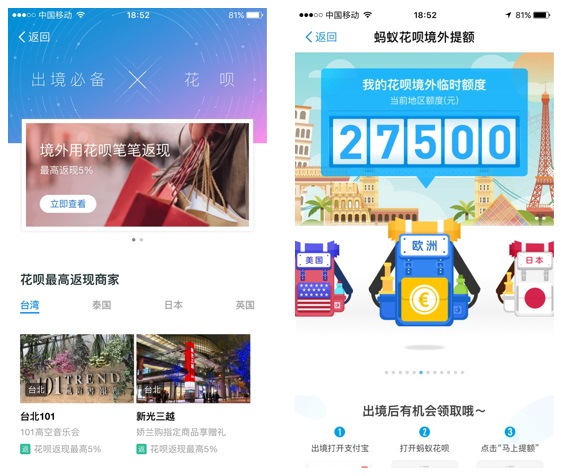 目前,支持支付寶的10多萬個商鋪都能用花唄付款,基本覆蓋了出境游客的日常消費場所。如果覺得還不夠花,可以在支付寶里申請花唄臨時提額,最高3萬元額度,保證你既能花又能省。