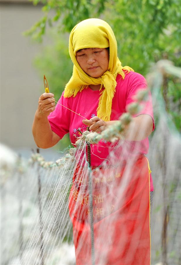 7月10日,黃驊市南排河鎮(zhèn)后范家堡村漁民在修補(bǔ)漁網(wǎng)。時(shí)下正值黃渤海休漁期,河北省黃驊市漁民充分利用“假期”修船、補(bǔ)網(wǎng),確保開(kāi)漁后安全生產(chǎn)。 新華社記者楊世堯攝