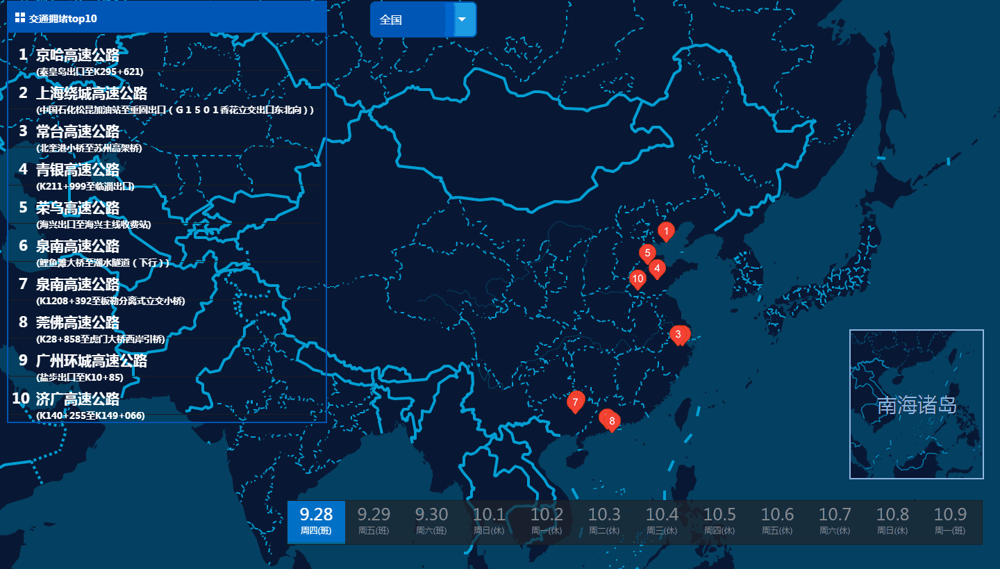 而9月28日至10月9日期間預(yù)測的十大擁堵路段中,10月1日的是沈海高速寶安收費站砸道橋至南通(南)出口、滬蓉高速蘇家灣中橋至棗莊服務(wù)區(qū)-加油站、京滬高速璜塘出口至顧周中溝橋、廣昆高速蓮塘出口至K106+538、滬渝高速K166+068至梨花橋(右橋)、長深高速K1819+022至熱水互通B砸道橋、長深高速羊田小橋2至K3529+315、沈海高速埔仔一橋至陸豐高速南加油站、寧洛高速十八河至中橋3右幅、京港澳高速元貝大橋至K2109+465。