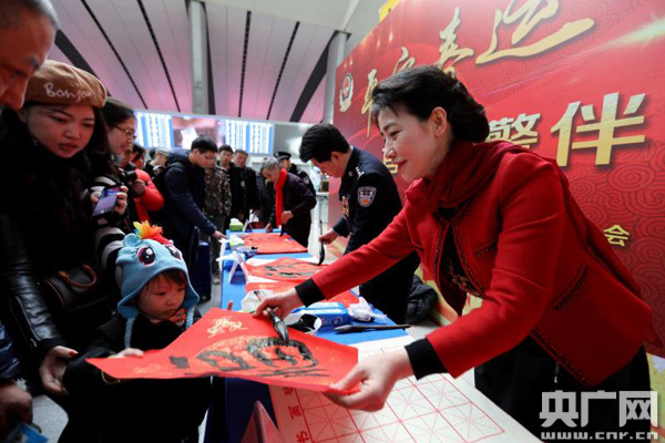 央廣網(wǎng)北京2月3日消息 2月2日,北京南站二樓候車室,“平安春運攜手送!锥艰F警伴您平安回家”的大紅展板非常醒目,來自警營的公安部文聯(lián)副主席、全國公安美協(xié)副主席李冬、鐵路公安文聯(lián)書畫家協(xié)會會員楊立勇攜手在京的國家一級美術(shù)師闞愛萍、海軍政治部美術(shù)創(chuàng)作員中國畫創(chuàng)作研究中心主任張禾、中國書法家協(xié)會會員北京通州書法家協(xié)會副主席兼秘書長黃添喜等書畫名家現(xiàn)場為廣大旅客寫“!弊、送祝福;顒蝇F(xiàn)場,旅客們手里拿著書畫家們送上的福字很是高興,不少人還與書畫家合影留念。
