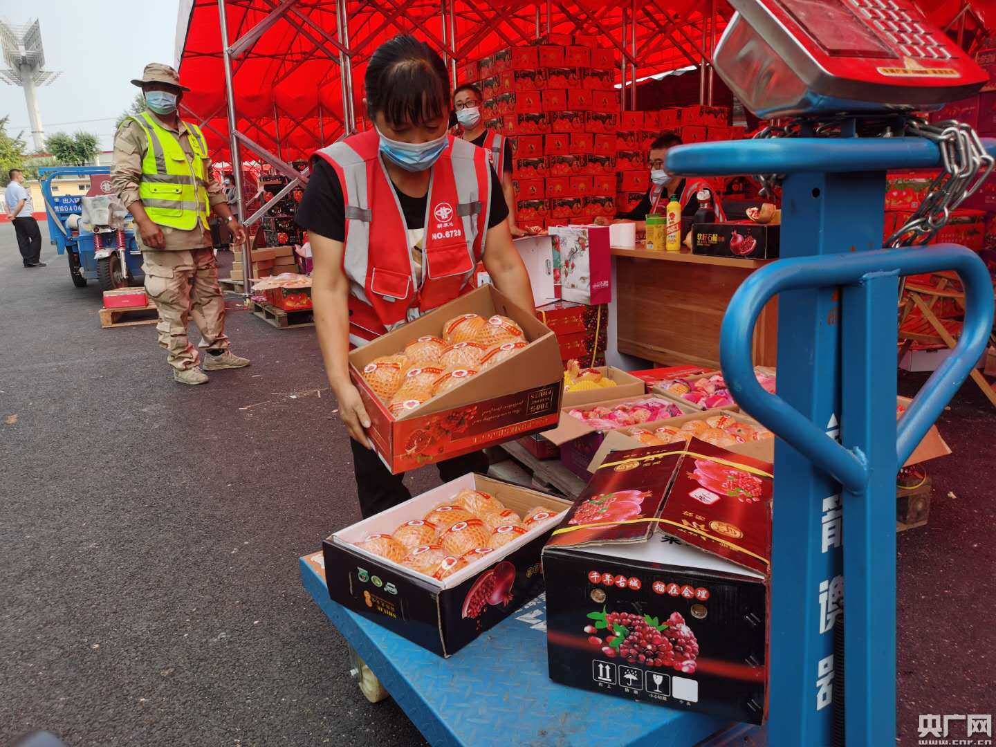 (新發(fā)地水果區(qū),賣石榴的批發(fā)商戶正在整理貨物。實習記者王紅霞 攝。)