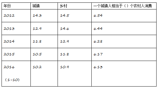 2012年一個城鎮(zhèn)人消費相當于6.54個農(nóng)村人消費,5年來這一比例在縮小,到2016年為6.13個農(nóng)村人消費,但是仍然沒有突破6的距離。