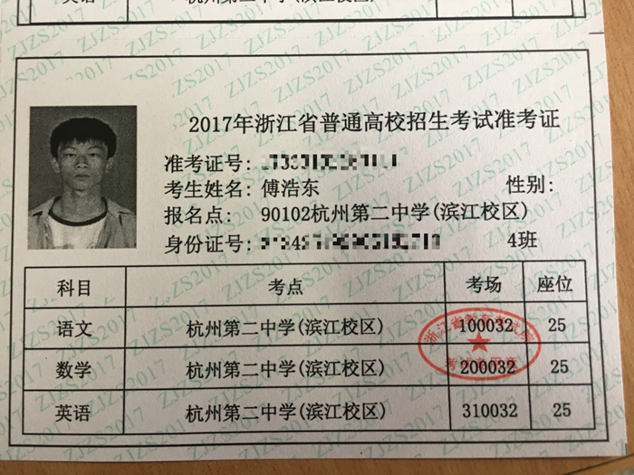2017年6月5日,浙江省杭州二中高三學(xué)生傅浩東從老師手里接過了準考證。