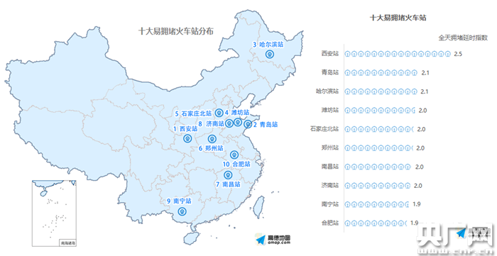 在火車(chē)站方面,從高德地圖交通大數(shù)據(jù)預(yù)測(cè)的全國(guó)主要火車(chē)站周邊道路擁堵數(shù)據(jù)分析看,十一長(zhǎng)假期間,西安站、青島站、哈爾濱站周邊道路擁堵程度最高,其中西安站周邊在十一期間的擁堵延時(shí)指數(shù)達(dá)到了2.5,青島站和哈爾濱站也達(dá)到了2.1,出行所需花費(fèi)的時(shí)間成本較大。