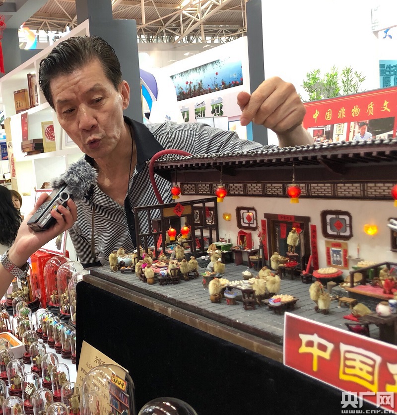 來(lái)自河南的朱先生一家在一個(gè)展位前停留了很長(zhǎng)時(shí)間,他們馬上要出國(guó)旅行,正在為外國(guó)朋友挑選幾件小禮物,最終,他們挑選了兩只“小猴子”。原來(lái),這些棗核大小的“小猴子”,是列入中國(guó)非物質(zhì)文化遺產(chǎn)名錄的民間手工藝術(shù),叫“毛猴”,它們的四肢是用蟬蛻(蟬褪下的空殼)做的,而身子是由一味叫做“辛夷”的中藥塑成,一個(gè)個(gè)小毛猴被手工藝人塑出各種生動(dòng)的動(dòng)作神態(tài),表達(dá)著諸如“長(zhǎng)壽”“吉祥”“孝順”“幸!钡纫庀。