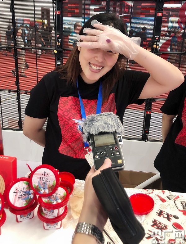 王沫華(左一)展示參展商品(中央廣播電視總臺(tái)央廣記者 李展鴻 攝)
