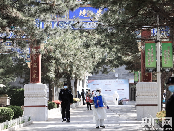 工作人員正在對路面進行消毒(央廣網(wǎng)記者 黃一博 攝)