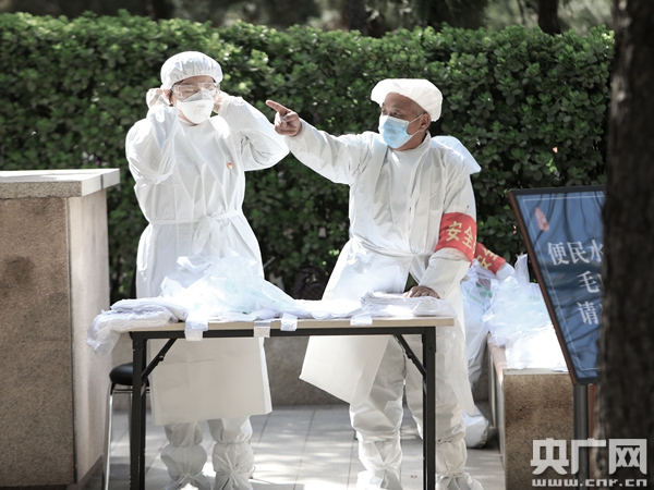 工作人員身著防護服,為前來祭掃的人們提供免費便民水袋和毛巾(央廣網(wǎng)記者 黃一博 攝)