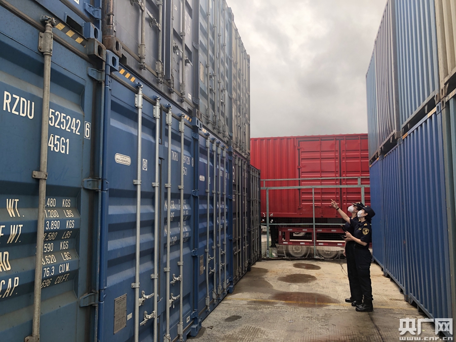 8月8日,廣州海關(guān)所屬廣州車站海關(guān)關(guān)員在廣州大朗物流基地海關(guān)監(jiān)管場所進行巡查(央廣網(wǎng)發(fā) 海關(guān)供圖)