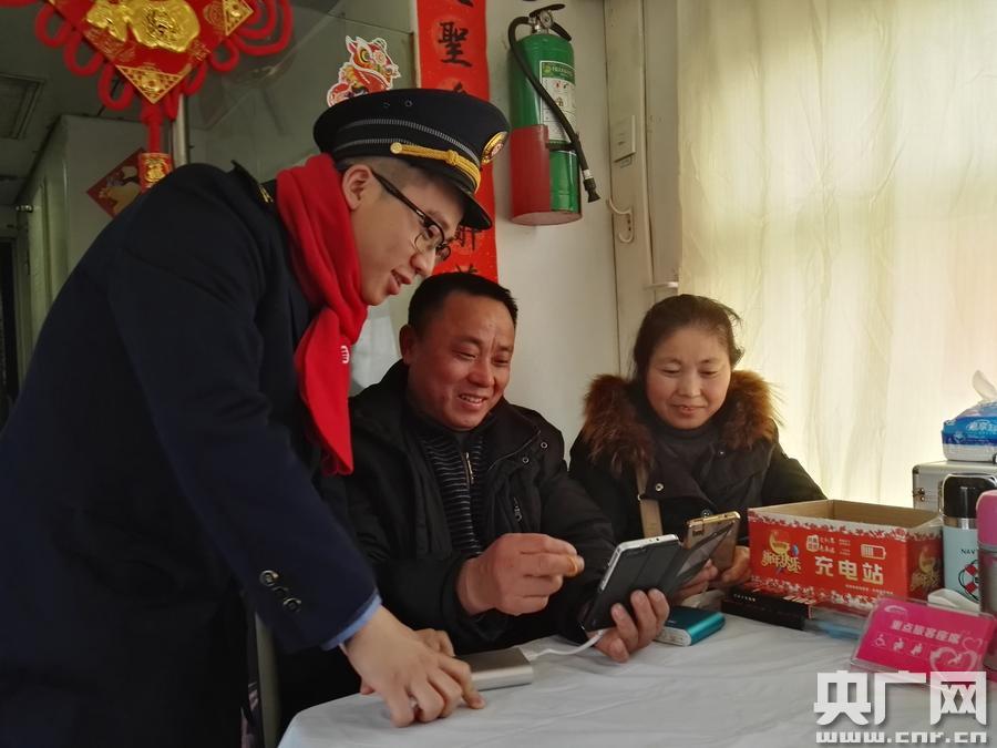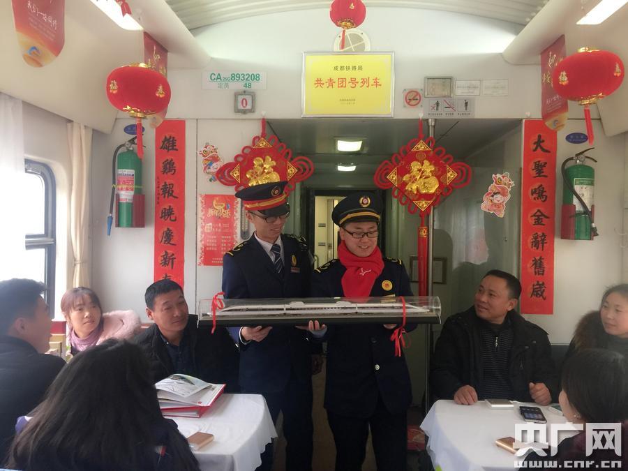 “共青團(tuán)號”專列護(hù)送四川農(nóng)民工開啟新征程(曲麗娟攝) 央廣網(wǎng)重慶2月7日消息(記者劉湛 通訊員曲麗娟)2月5日,在成都鐵路局從成都開往上海的K4140次“共青團(tuán)號”列車上,成都動車段技術(shù)骨干王成維手捧CRH380A型動車模型,正在為9號車廂內(nèi)的旅客和小朋友講述高鐵發(fā)展歷程。 隨著春節(jié)小長假的結(jié)束,四川農(nóng)民工又開始離家外出務(wù)工,從成都開往上海的普速列車客流量再創(chuàng)春運(yùn)高峰,幾乎每趟列車都是滿載而去,空車而回,堪稱農(nóng)民工“專列”。為此,成都動車段159名團(tuán)員青工主動請纓加入到春運(yùn)臨客值乘的隊(duì)伍中,以保證更多的列車投入運(yùn)營,護(hù)送四川民工開啟雞年新征程。 當(dāng)晚20:01分,貼著窗花、燈籠和春聯(lián)的列車洋溢著喜慶,滿載著溫馨從成都站出發(fā)了。途中團(tuán)員青工們與旅客共同開展了包湯圓“一起過節(jié)”活動,一起吃著熱和的湯圓,拉近彼此心與心的距離,讓一路的關(guān)懷沖淡旅客離家的落寞和沮喪。由技術(shù)骨干王成維帶頭展開的高鐵知識普及講座更是收獲了很多旅客和小朋友的關(guān)注點(diǎn)贊。 據(jù)悉,該趟由成都鐵路局成都動車段團(tuán)員青年擔(dān)當(dāng)?shù)摹肮睬鄨F(tuán)號”列車不僅設(shè)置了愛心充電站、暖心讀書角,還為旅客配置了應(yīng)急醫(yī)藥箱,開設(shè)高鐵知識微講堂和重點(diǎn)旅客“點(diǎn)對點(diǎn)”服務(wù)等,通過溫馨服務(wù)讓外出務(wù)工的農(nóng)民工感受到濃濃的鐵路真情。 -