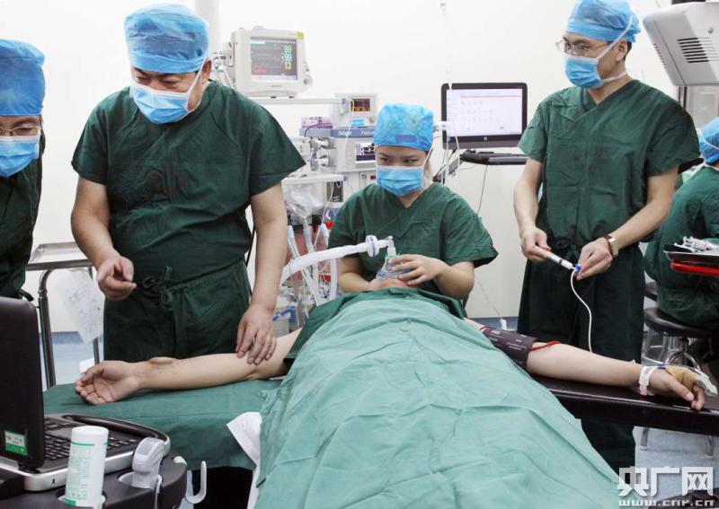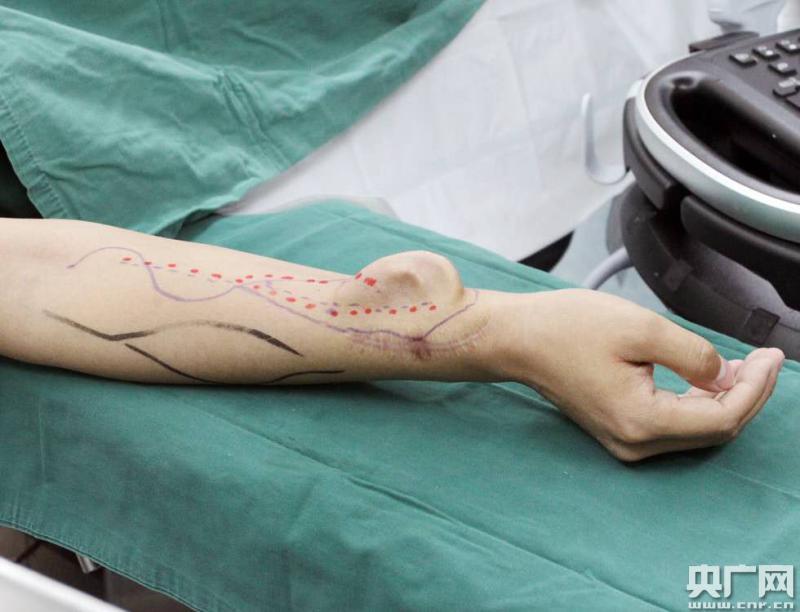 整形外科醫(yī)生可以說是醫(yī)生中的藝術(shù)家。西安交大一附院專家在這次手術(shù)中要做的就是“移花接木”。手術(shù)開始前,郭樹忠和舒茂國教授團(tuán)隊使用便攜式血管探測儀確認(rèn)了“再造耳”血管的位置,用紅色的筆在手臂上詳細(xì)標(biāo)記。整個手術(shù)的重中之重就是把胳膊上的“耳朵”帶著皮下10多厘米長的血管移植到頭部,并和頭部動脈、靜脈進(jìn)行吻合,以確保前臂再造耳是“活的”。