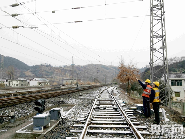 1月27日,成都供電段組織干部職工對此次降雪受影響區(qū)段接觸網關鍵設備進行巡視。(李煒 攝)