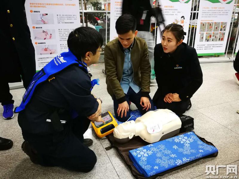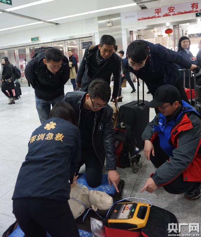 在深圳火車站長途列車候車室的活動現(xiàn)場,深圳市急救中心和深圳火車站的工作人員一同向旅客演示運用AED以及心肺復(fù)蘇進行搶救的操作方法,并邀請旅客參與體驗。深圳急救工作中心的工作人員還通過展示海報、派發(fā)宣傳資料以及講解等方式向旅客普及急救常識。