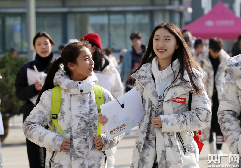 1月24日,來自河北秦皇島的考生韋懿寧(右)在結束最后一場考試后和同學在浙江傳媒學院留影。(央廣網(wǎng)記者 魏煒 攝)