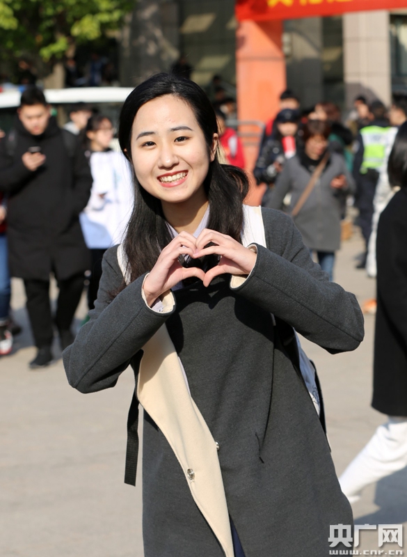 1月23日,來自江蘇徐州的考生郭寒走出考場后擺出“心型”造型慶祝。(央廣網(wǎng)記者 魏煒 攝)