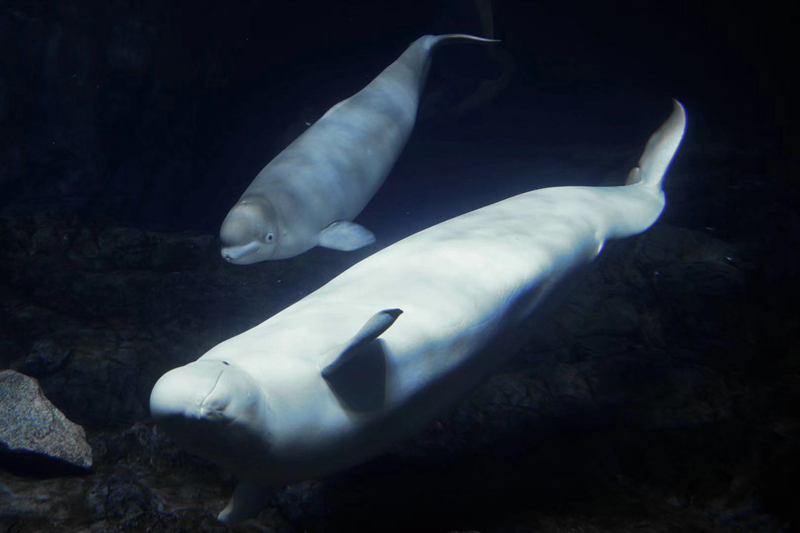 記者現(xiàn)場(chǎng)看到,三只白鯨寶寶時(shí)不時(shí)來一些“搗蛋”行為,有時(shí)趴在媽媽的脊背上不停地點(diǎn)頭,還會(huì)故意游到媽媽身體后方,玩起捉迷藏。據(jù)李湛偉介紹,白鯨是高度集群動(dòng)物,社交活動(dòng)十分豐富,喜歡聚在一起社交、游泳及育幼。