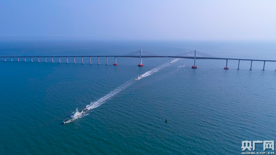 圖為汕頭海警局編隊(duì)艦艇經(jīng)過汕頭南澳大橋(央廣網(wǎng)發(fā) 汕頭海警局供圖)