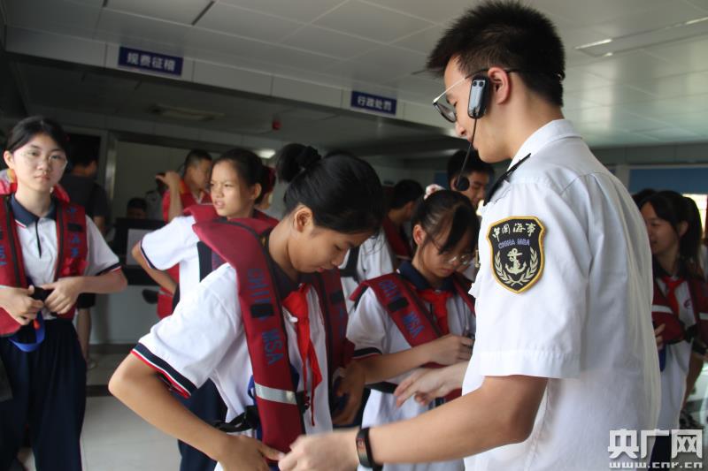 “首先呢,我們要將救生衣反過來,兩只手穿過去,然后套在頸上,扣上卡扣,并調(diào)整好扣帶的松緊,使救生衣能完全貼合在身體上。”海事執(zhí)法人員現(xiàn)場演示了如何正確穿戴救生衣,并協(xié)助同學們穿戴好救生衣。